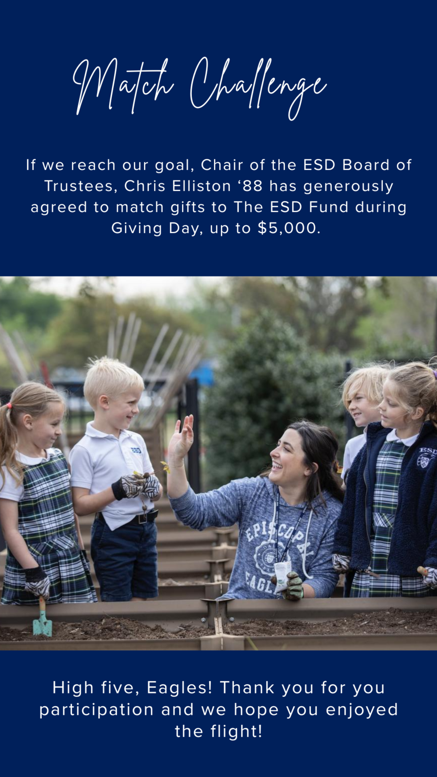 The Chair of the ESD Board of Trustees, Chris Elliston ‘88, has generously agreed to match gifts to The ESD Fund during Giving Day, up to $5,000.00.