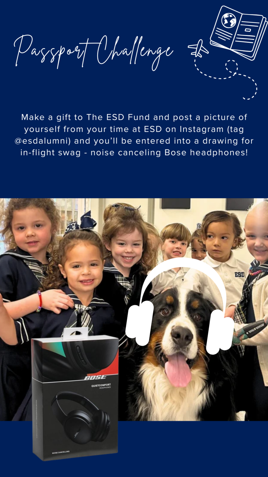 Make a gift to The ESD Fund and post a picture of yourself from your time at ESD on Instagram (tag @esdalumni) and you’ll be entered into a drawing for BOSE Quiet Comfort headphones. The winner will be announced at 8:00 p.m.